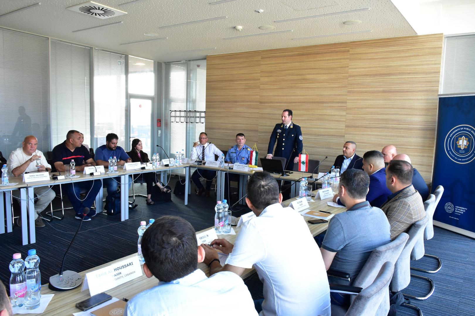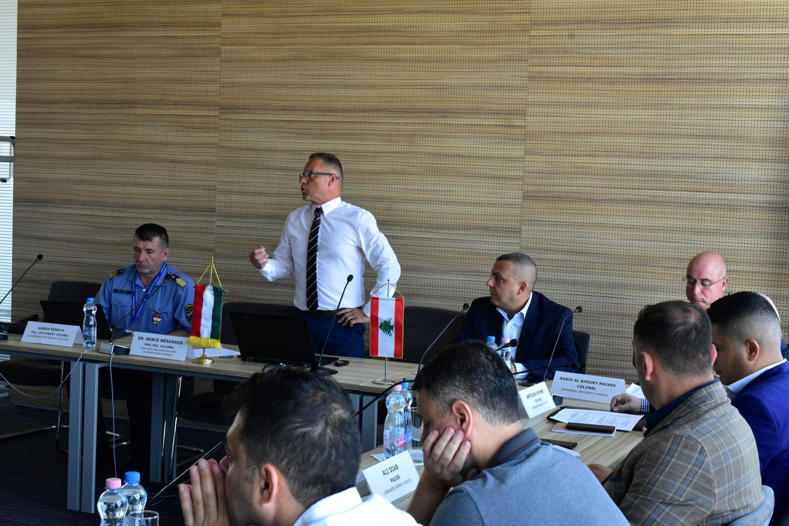 Az EU által finanszírozott projekt célja a határellenőrzéssel kapcsolatos szakmai ismeretek átadása, amellyel hatékonyan támogatjuk a libanoni határőrizeti szervek munkáját az illegális migráció, valamint az államhatárral kapcsolatos bűncselekmények elleni harcban. A projekt első fázisában Kalmár Ádám r. alezredes, a Baranya Vármegyei Rendőr-főkapitányság Idegenrendészeti Osztályának vezetőhelyettese és Németh Gábor r. alezredes, a Határrendészeti Tanszék tanársegédje – mindketten az NKE RDI doktorandusz hallgatói – június 11–14. között Bejrútban tartottak a témához kapcsolódó elméleti felkészítést. Az előadásokon a résztvevők általános képet kaptak az Integrált Határigazgatás működéséről, a szervezeten belüli, szervezetek közötti, valamint a nemzetközi határrendészeti együttműködésről, a kockázatelemzésről, közös műveletek végrehajtásáról. A projekt második fázisában, július 17–21. között a libanoni rendvédelmi vezetők a Nemzeti Közszolgálati Egyetem Rendészettudományi Karán megismerhették az Integrált Határigazgatáshoz kapcsolódó hazai képzési rendszert. Az egyetemen kapott elméleti ismeretek mellett a csoport tagjai szakmai látogatáson vettek részt többek között az ORFK Rendészeti Főigazgatóságon, a Komárom-Esztergom Vármegyei Rendőr-főkapitányság Rendészeti Igazgatóság Mélységi Ellenőrzési és Közterületi Támogató Alosztályánál, valamint megtekintették a Nickelsdorf-Hegyeshalom Kapcsolattartási helyet.