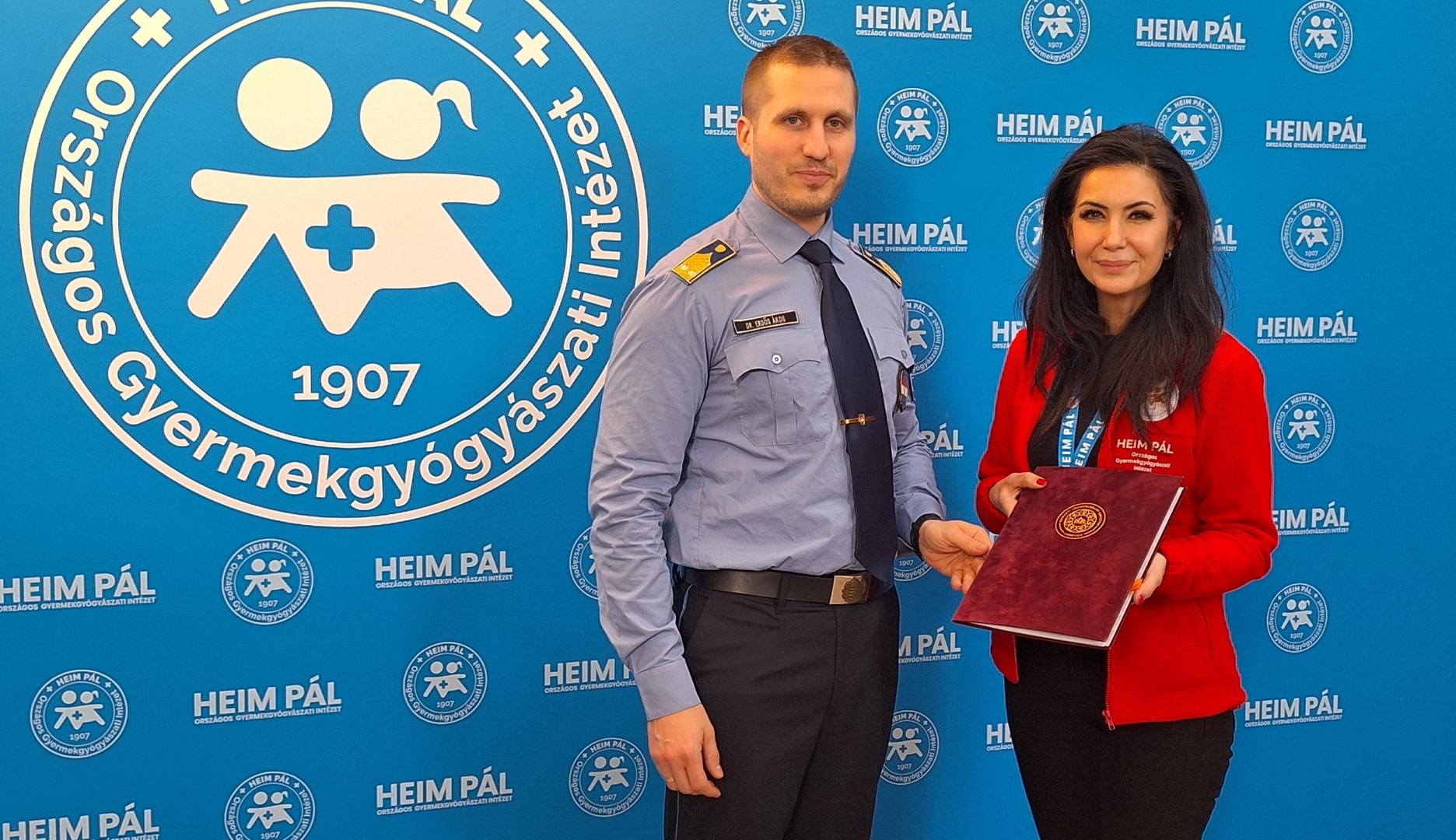 Jelentős mérföldkőhöz érkezett a Nemzeti Közszolgálati Egyetem és a Heim Pál Országos Gyermekgyógyászati Intézet közötti kapcsolat: 2026. január 8-án az NKE Rendészettudományi Kar Fejlesztési Osztályának vezetője, Dr. Erdős Ákos r. alezredes és munkatársai személyesen adták át a két intézmény közötti együttműködési megállapodást aláírásra, melyet az Intézet kommunikációs igazgatója, Mogyorósi Zsuzsanna vett át.