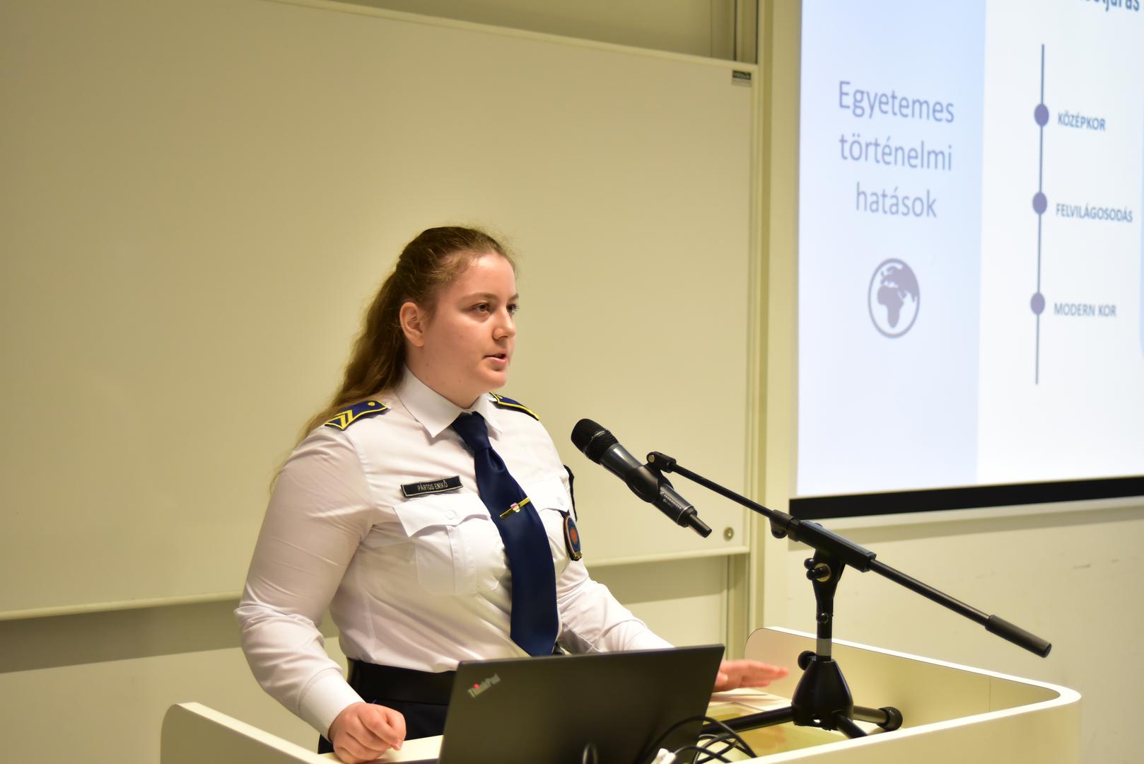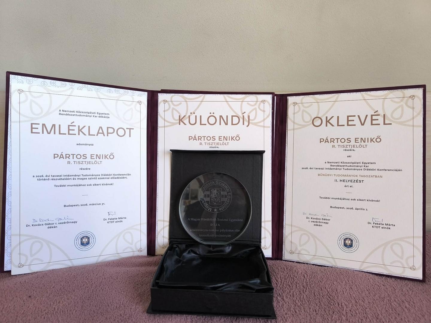 A Bűnügyi Tudományok Tagozatban Pártos Enikő rendőr tisztjelölt mutatott be kiemelkedő dolgozatot. Kutatásában a visegrádi országok büntetőeljárási rendszereinek összehasonlító vizsgálatára vállalkozott, különös tekintettel a történeti gyökerekre és az európai jogi hatások tükrében végbement változásokra. Az alapos forráskutatáson és rendszerszintű elemzésen alapuló munkát a bírálóbizottság a tagozat második helyezésével ismerte el, emellett a hallgató A Magyar Bűnüldözők Szakmai Egyesületének különdíjában is részesült. Munkáját Vári Vince rendőr alezredes konzulensként segítette.