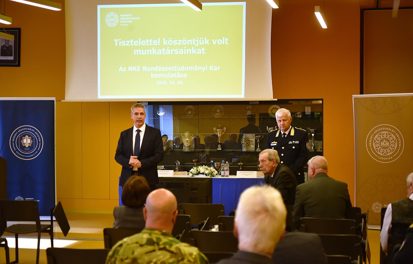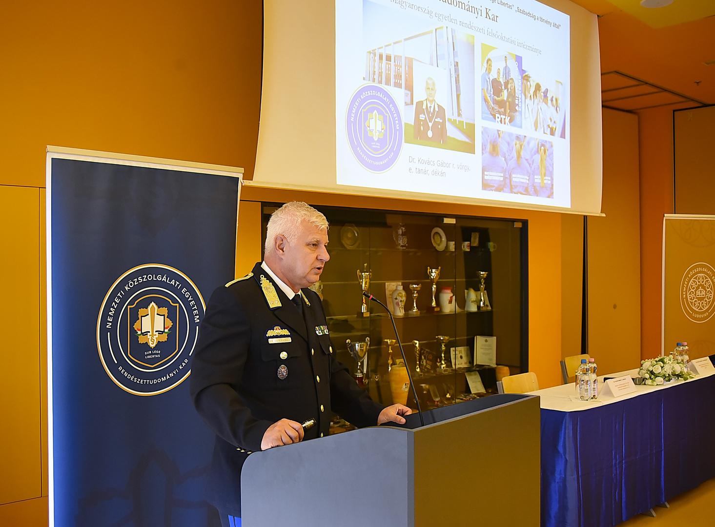 Ezt követően Kovács Gábor r. vezérőrnagy a Rendészettudományi Kar dékánja előadásában bemutatta a Kar több mint egy évtizedes fejlődését. Ismertette a karon folyó képzések tartalmát, az oktatási portfólió teljes spektrumát. Külön részletezte, hogy milyen eredményeket ért el a kar az oktatás és a tudományos kutatás területén, kitérve a mesterséges intelligencia használatára, és a legkorszerűbb oktatási módszerek, mint például a virtuális valóság alkalmazására.